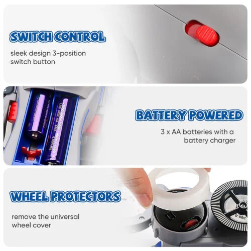 Menggunakan 2pcs baterai (belum termasuk) bisa berputar 360 derajat,ada lampu dan suara.