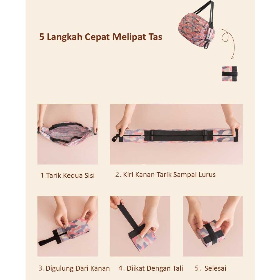 Tas belanja dapat dengan mudah dilipat dan digulung menjadi ukuran kecil agar mudah disimpan dan dibawa kemana-mana kapan saja. Simpan dengan mudah di saku atau dompet untuk menghemat ruang. Jadikan perjalanan belanja Anda mudah dan menyenangkan.