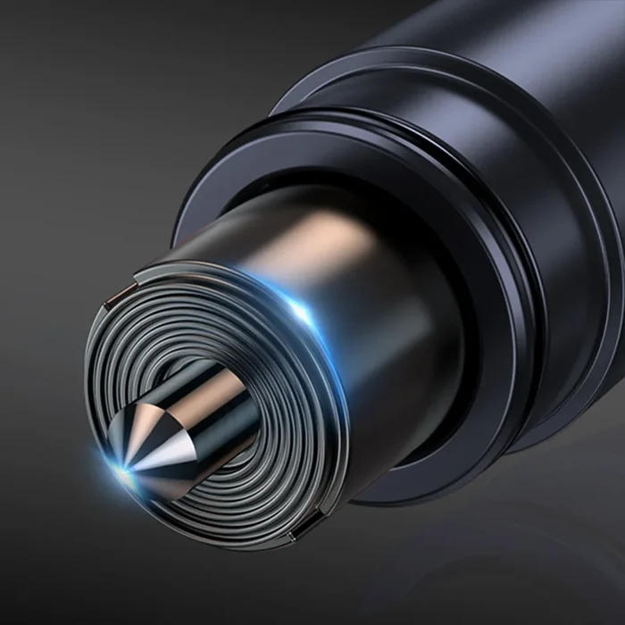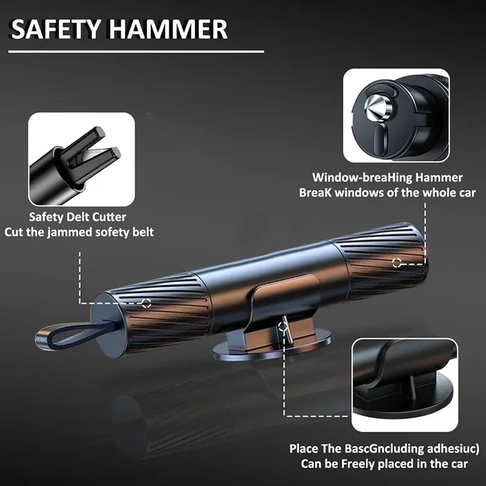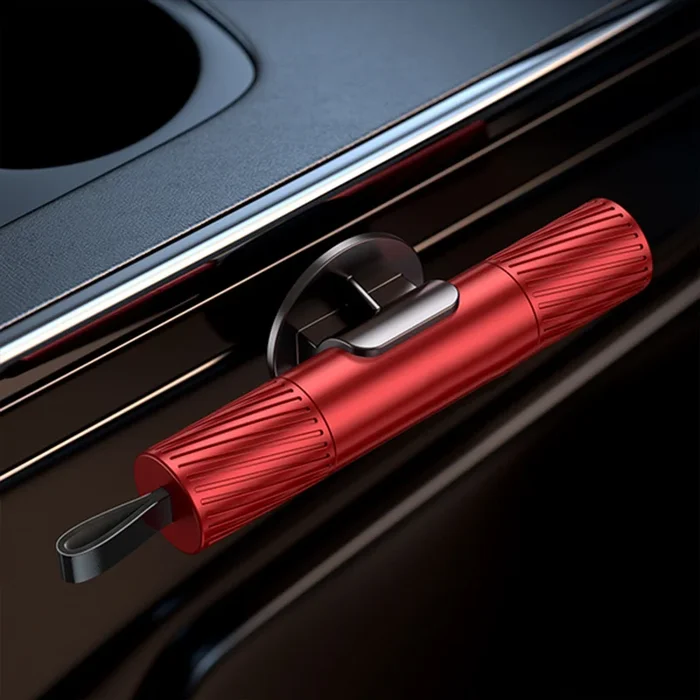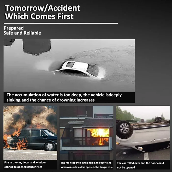 Pemotong sabuk pengaman : pemotong sabuk pengaman dilengkapi dengan pemotong baja tahan karat bawaan dengan desain tepi pisau tersembunyi berbentuk U, memastikan keamanan dan mencegah cedera tangan. Cukup sejajarkan mulut pemotong berbentuk U dengan sabuk pengaman, dorong ke depan dengan cepat, dan keluar dari kendaraan dengan mudah dan cepat